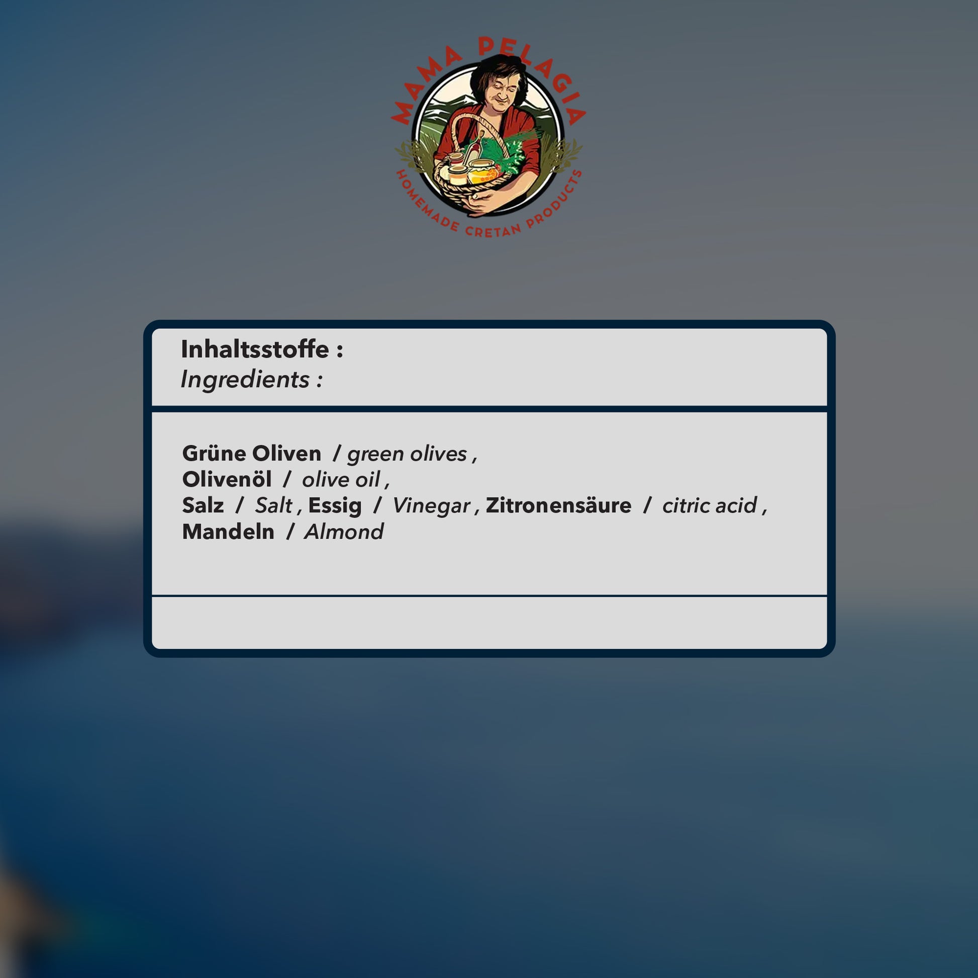 Grün, gefüllt mit Mandeln und konserviert in natürlicher, salzarmer Salzlake.