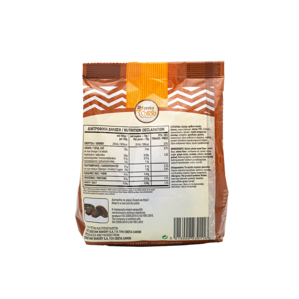 Diese ausgewählten Johannisbrotkekse werden mit Sorgfalt und Tradition hergestellt und zeichnen sich durch den reichhaltigen und nussigen Geschmack des Johannisbrotbaums aus, einer beliebten Zutat der kretischen Küche. Johannisbrot ist für seine natürliche Süße und seinen gesundheitlichen Nutzen bekannt, was diese Kekse sowohl lecker als auch nahrhaft macht.