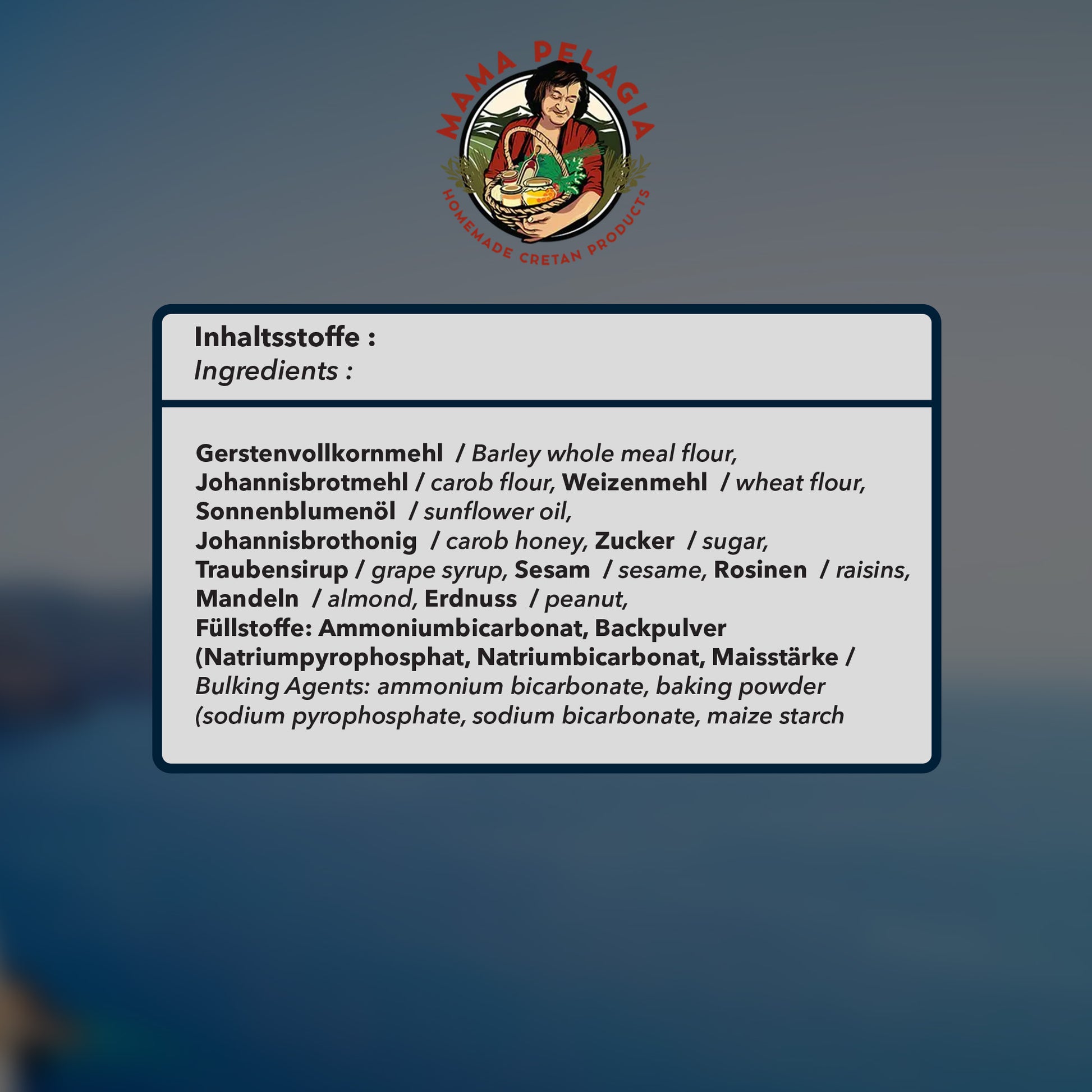 Mama Pelagia wählt diese Kekse sorgfältig von lokalen Lebensmittelherstellern aus, die Wert auf Qualität und Geschmack legen. Sie sind ein wahres Abbild des mediterranen Terroirs, wo köstliche Aromen und gesunde Zutaten zusammenkommen.