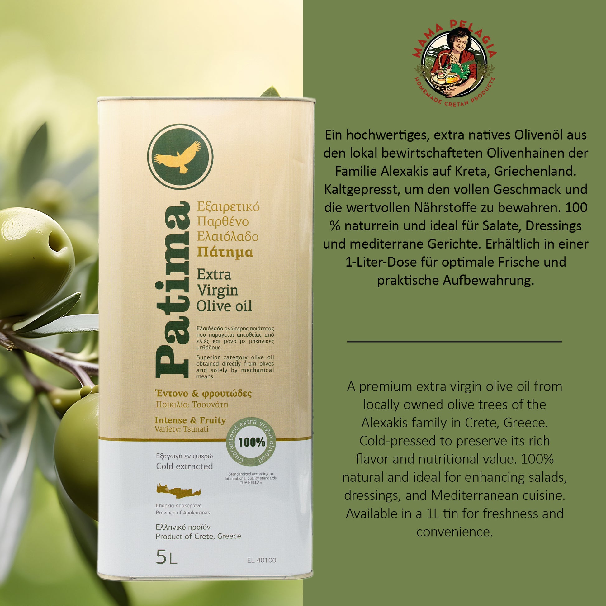 Das native Olivenöl extra von Patima ist rein und natürlich, ohne chemische Zusätze und mit einem angenehmen Nachgeschmack.